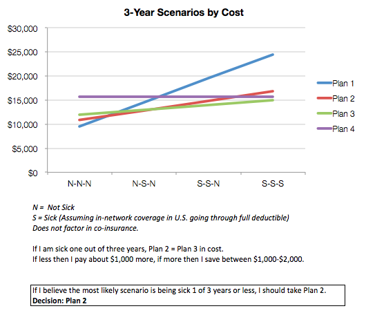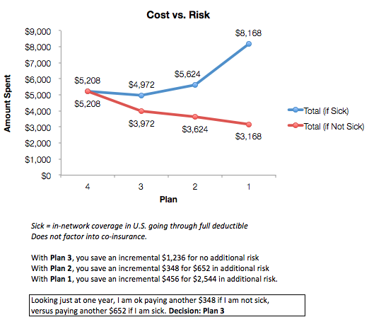 Cost of four plan options based on being very sick (burning through entire co-pays) or not being sick at all: