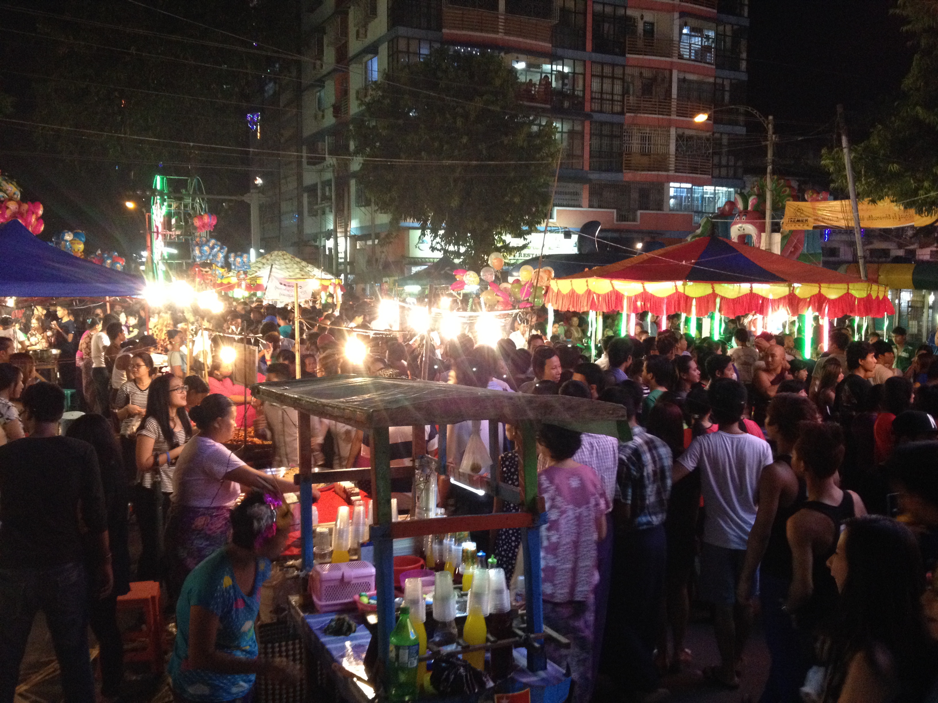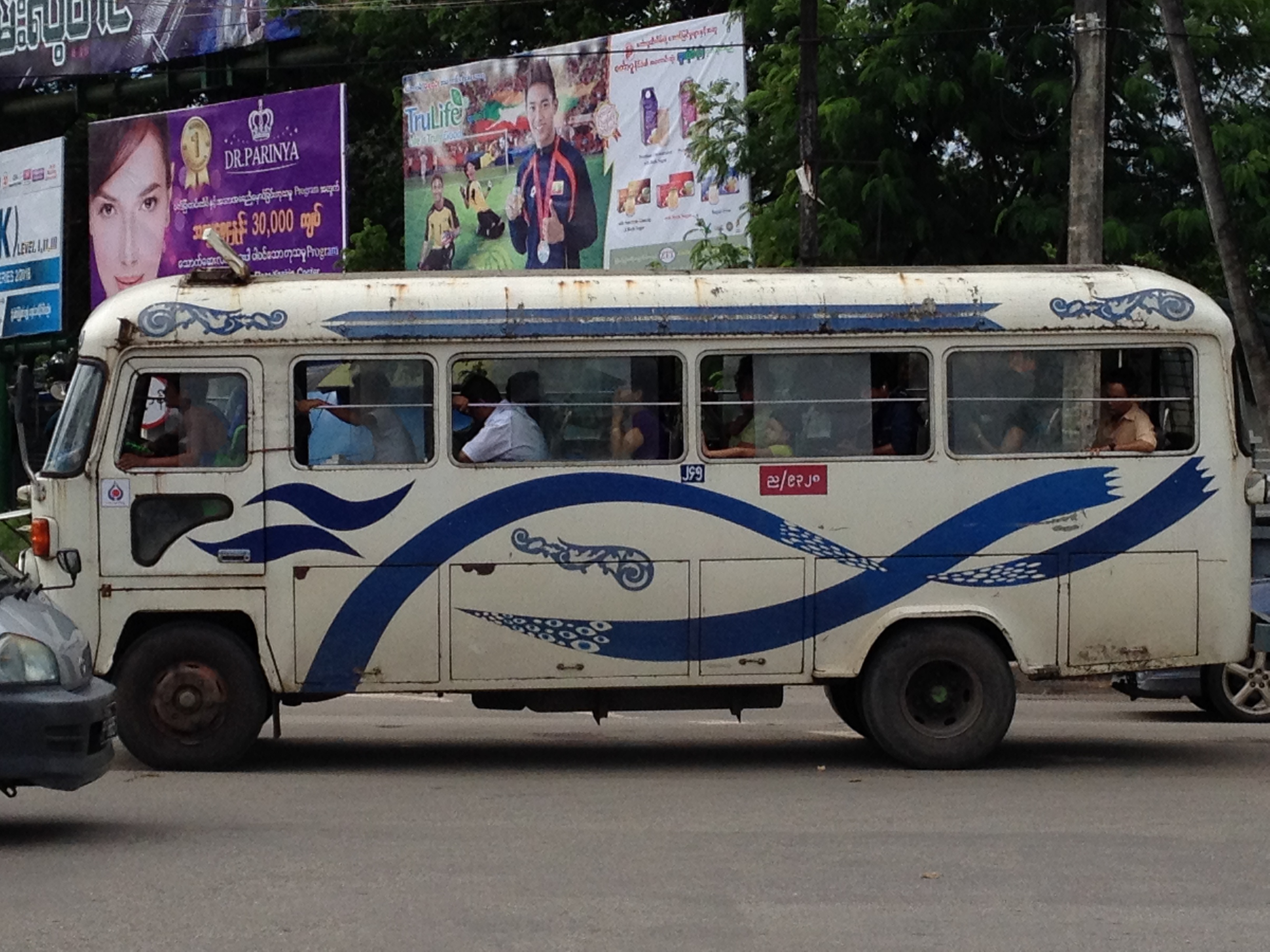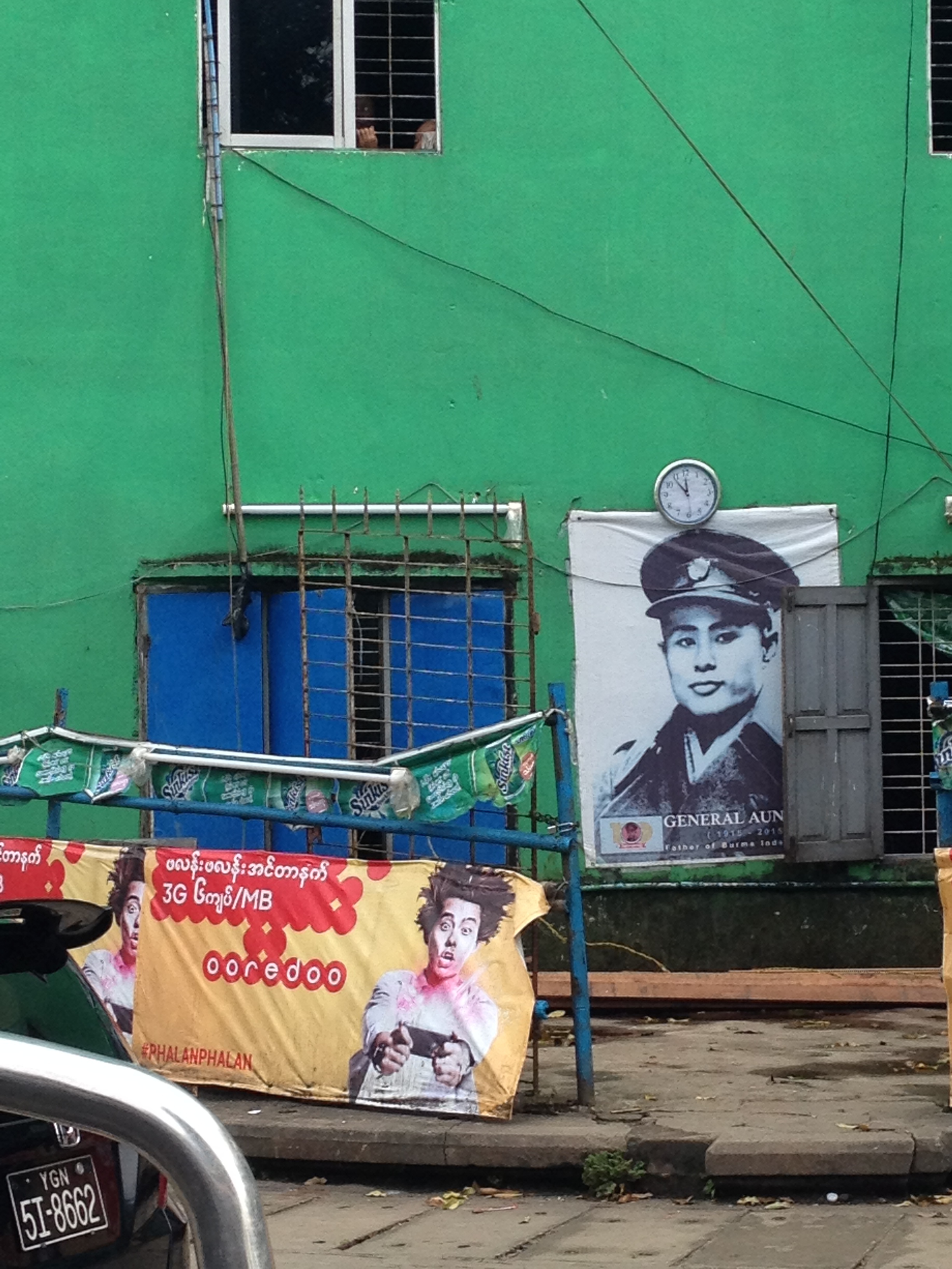 Note: You can also see an advertisement for Ooredoo in the foreground, which is one of the two private mobile operations (the other being Telenor) in addition to the government operator (MPT). I believe that green wall is actually part of a huge advertisement on the side of a building for Sunkist.