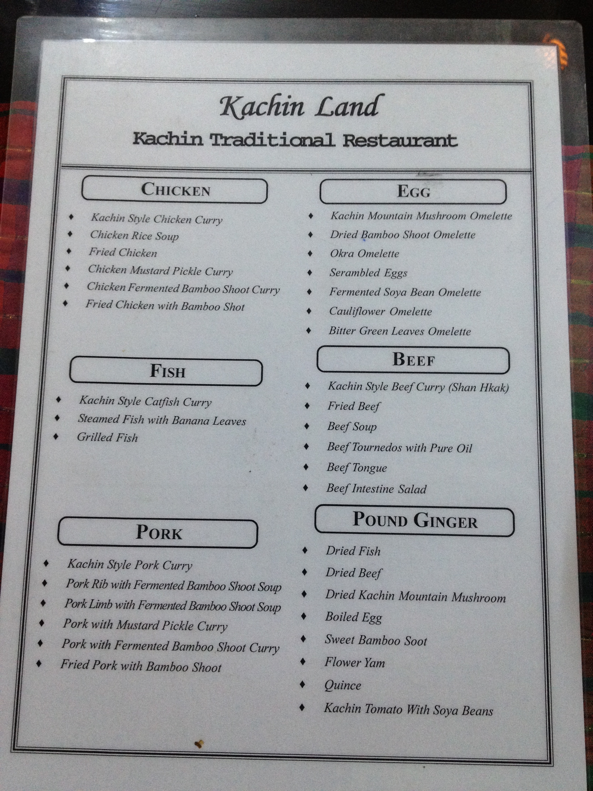 Here’s is part of a menu from a restaurant I went to the other day with a few friends (two of them had birthday). Kachin is a ethnic minority in northeastern Myanmar. Here’s more info: https://en.wikipedia.org/wiki/Kachin_State.
